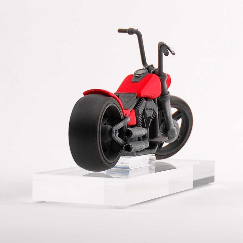 Motocicleta tipo chopper impresa con PLA (Acido poliláctico) con tecnología de calidad en impresión 3D FDM. El PLA es un bioplástico y termoplástico sostenible. Se obtiene a partir de la fermentación de vegetales como el maíz, la yuca o la caña de azúcar entre otros.