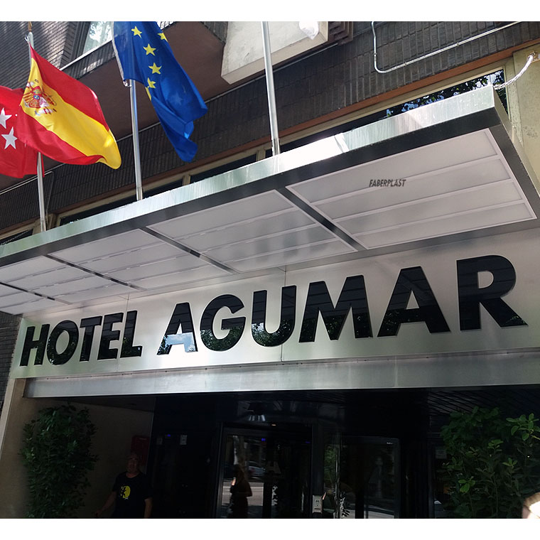Elegante rótulo de metacrilato realizado para fachada del HOTEL AGUMAR en Madrid.