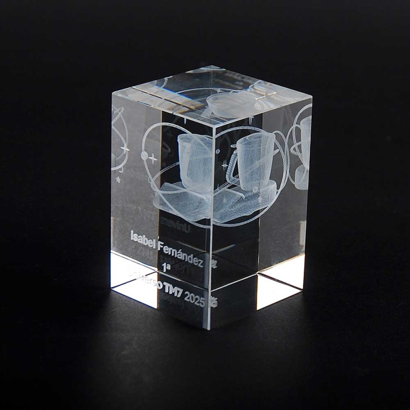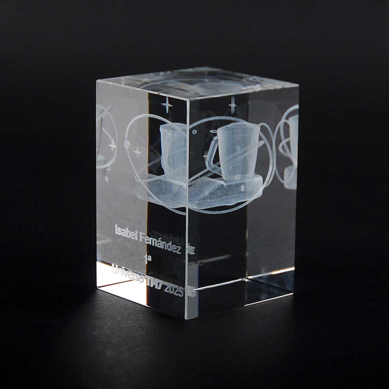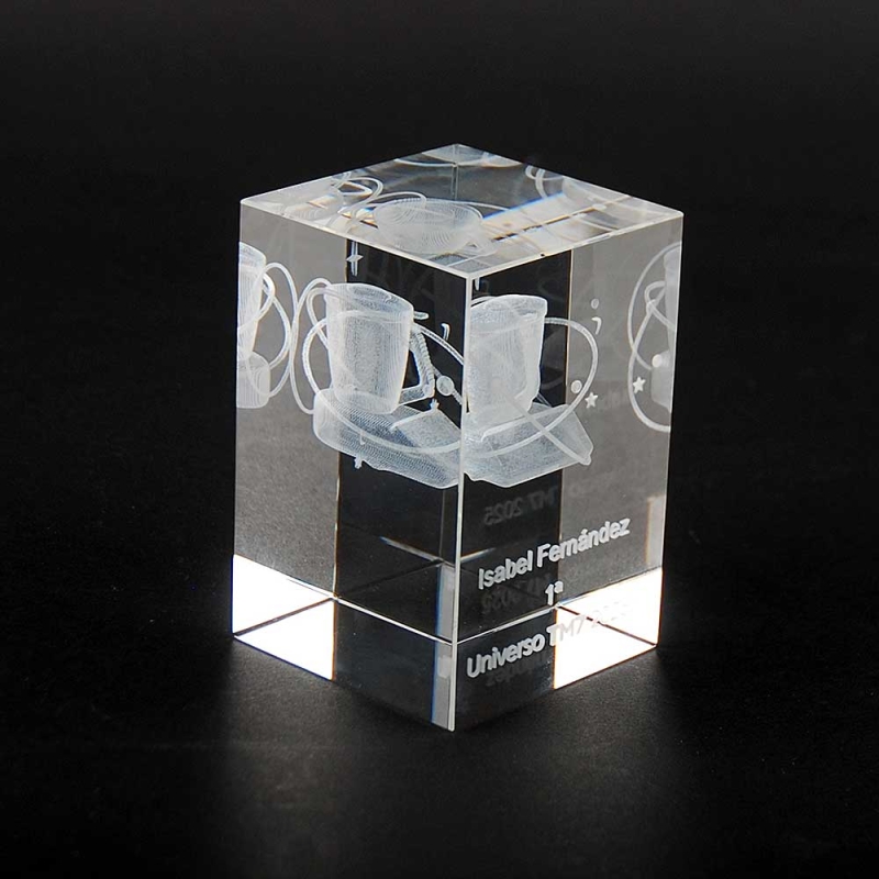 Elegante cubo fabricado en cristal óptico macizo, diseñado para ofrecer una presentación distinguida y contemporánea. Su interior alberga un grabado láser 3D de alta precisión, que genera una representación tridimensional suspendida dentro del bloque, logrando un efecto visual de profundidad y luminosidad incomparable.