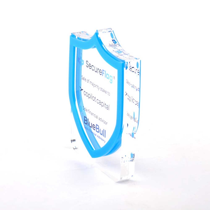 Bloque de metacrilato realizado ad-hoc para la marca SECURE FLAG en colaboración con BLUE BULL.