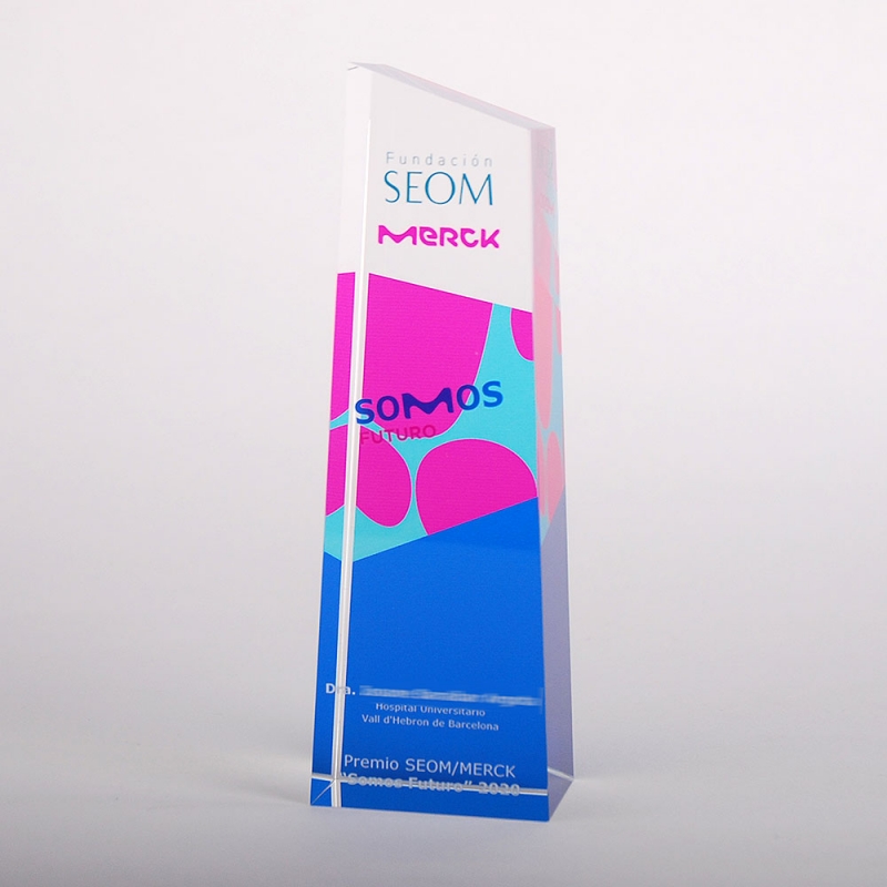 Premio en formato bloque de metacrilato realizado para la SOCIEDAD ESPAÑOLA DE ONCOLOGÍA MÉDICA en colaboración con la compañía MERCK y el Hospital Universitario Vall d´Hebron de Barcelona.