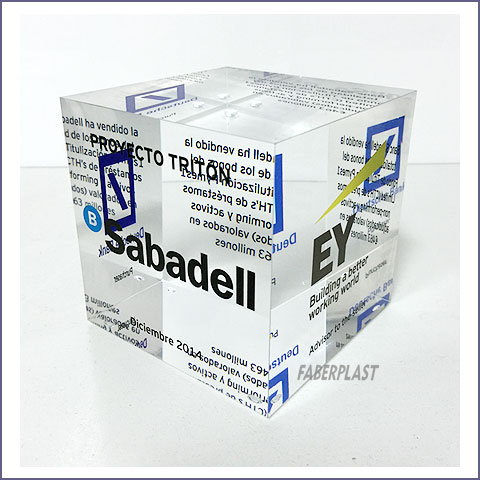 Bloque metacrilato realizado para el proyecto Tritón-Banco Sabadell. Fabricados a medida con placas de metacrilato transparente (Plexiglas-pmma) alto espesor. Incluye decoración en 5 caras mediante impresión digital directa de alta calidad con diseño y logotipos aportados por el cliente.