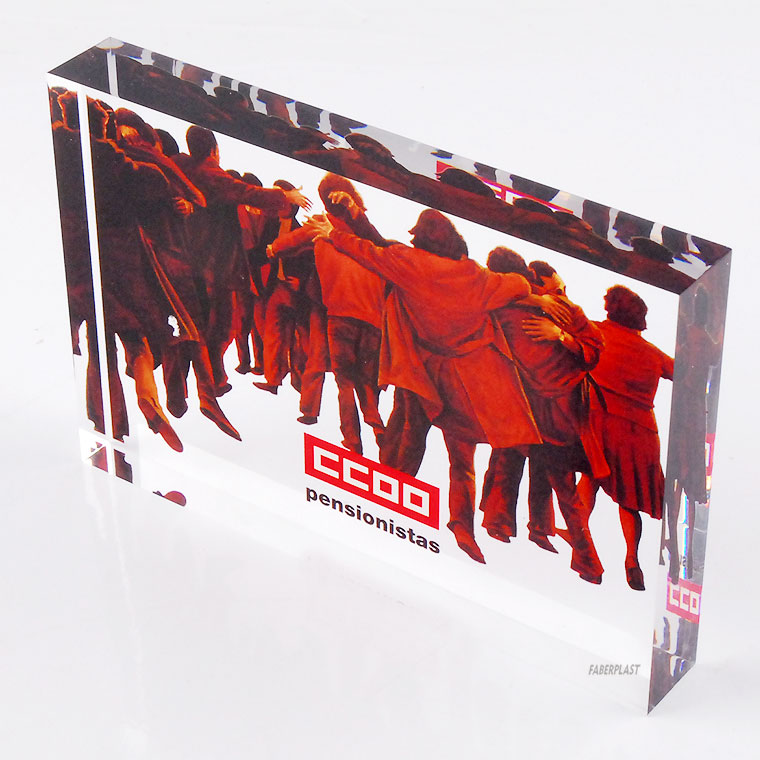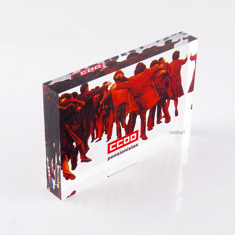 Bloque metacrilato realizado a medida para COMISIONES OBRERAS (CCOO). Fabricado con placas de metacrilato transparente (Plexiglas-pmma) alto espesor impresas en digital.