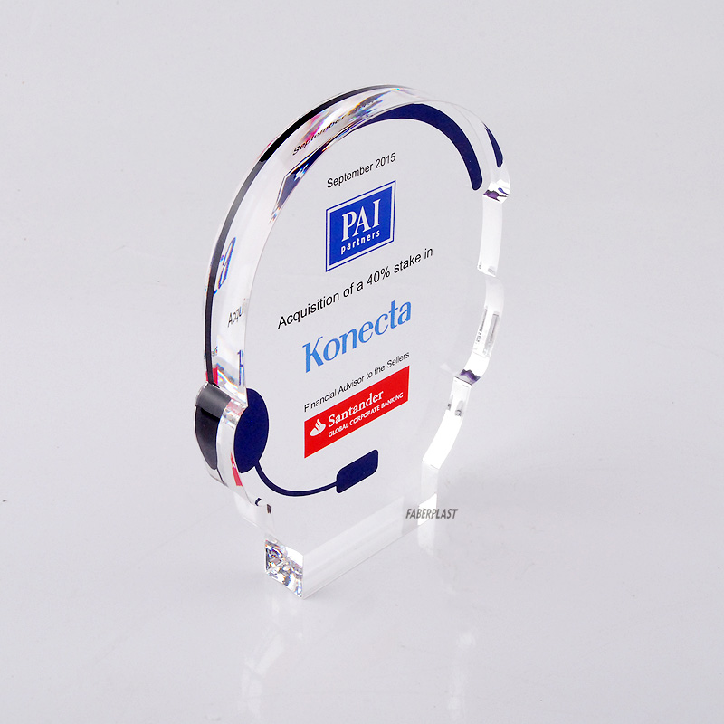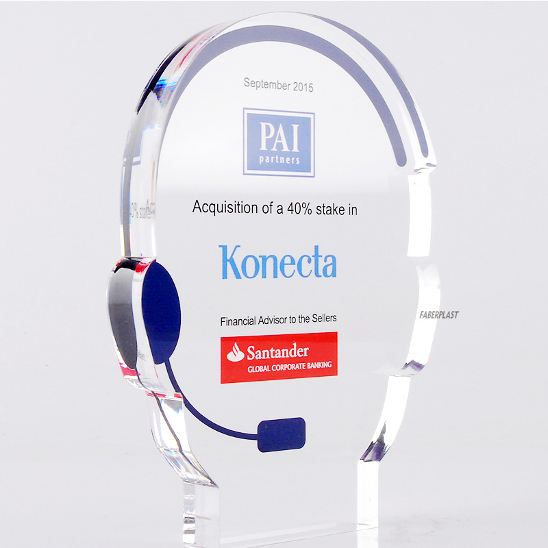Bloque metacrilato realizado de forma personalizada para la compañía KONECTA. Fabricados con placas de metacrilato transparente (Plexiglas-pmma) alto espesor, silueteados por láser con forma según diseño cliente y con impresión digital directa de alta calidad.