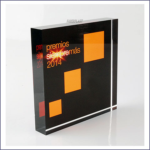 Bloque metacrilato realizado para la entrega de los PREMIOS SIEMPRE MAS 2014 de la compañia ORANGE: http://http://www.premiosiempremas.es Fabricados a medida con placas de metacrilato transparente (Plexiglas-pmma) de alto espesor, rotuladas con diseño aportado por el cliente mediante impresión digital directa de alta resolución.