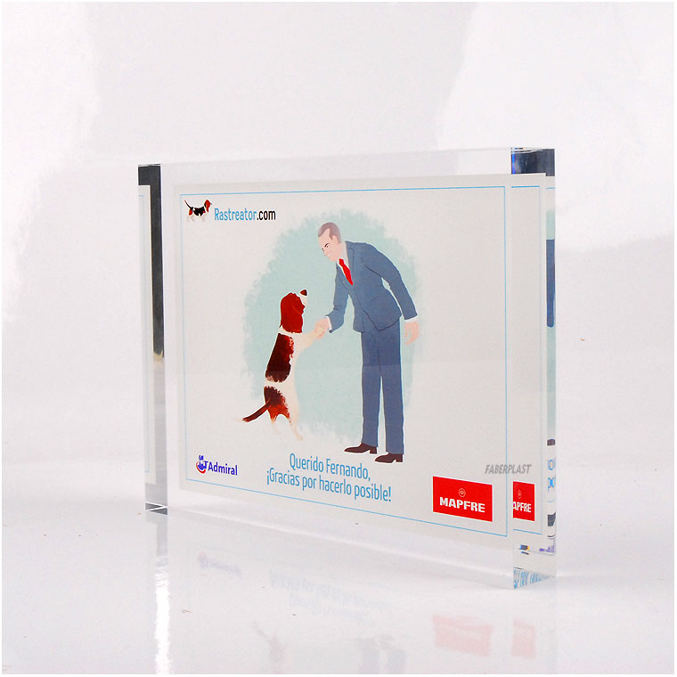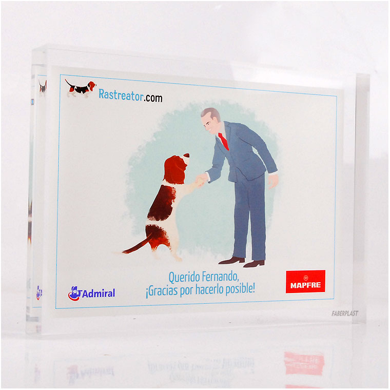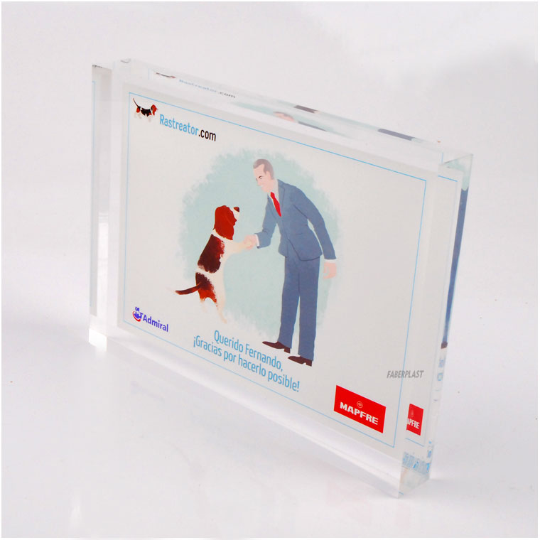 Regalo fabricado de forma personalizada con placas de metacrilato transparente (Plexiglas-pmma) de alto espesor, incluye decoración de logos y textos con impresión digital directa de alta calidad, sin adhesivos y con tintas ecosolventes.