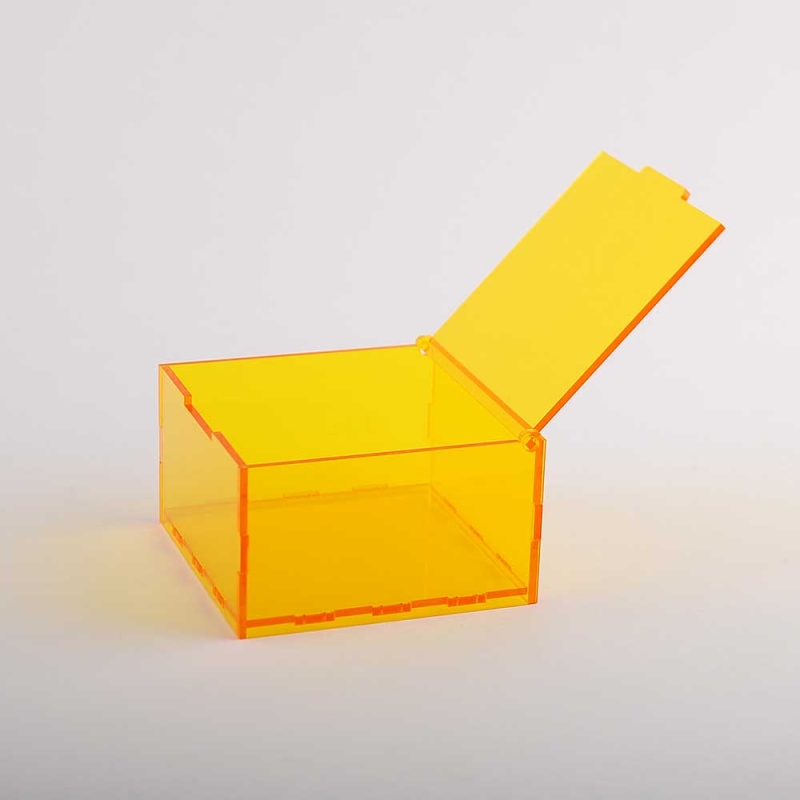 Caja fabricada a medida en metacrilato FLUOR de color amarillo con tapa abatible, ideal para almacenamiento, exposición o uso promocional. Su diseño geométrico y limpio combina funcionalidad y estética, aportando un toque muy luminoso y llamativo gracias a su acabado en color. Cantos suaves y pulidos incoloros extra brillantes