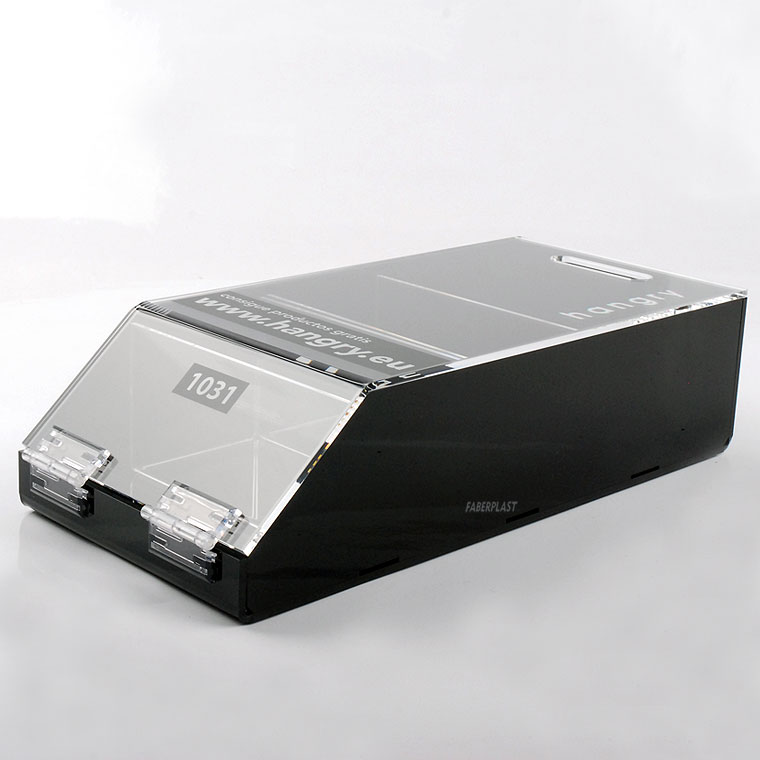 Fabricadas con placas de metacrilato transparente y metacrilato negro alto brillo (Plexiglas-pmma), formada con separadores interiores, asa, bisagras y tapa abatible. Incluye impresión digital de textos y logotipo en tapa.
