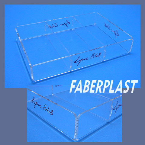 Caja LOPEZ ECHETO realizada en Metacrilato transparente (Plexiglas-pmma) con decoración de serigrafí­a en los laterales y separadores interiores para formar varios huecos. Incluye tapa encastrada de metacrilato transparente.