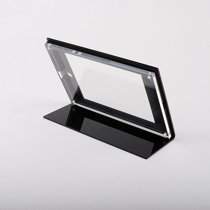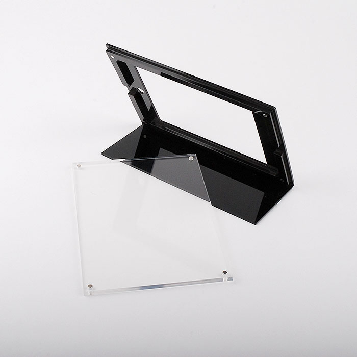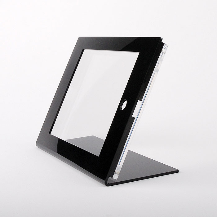 Fabricación artesana con placas de metacrilato transparente (Plexiglas-pmma) y metacrilato negro alto brillo que se unen fácilmente con 4 imanes de neodimio en cada esquina, para rápida manipulación del Ipad, se puede colocar y sacar cómodamente para su utilización en cualquier mesa y darle a la tablet un uso concreto que no requiere a penas manipulación, además se mantiene protegido de golpes, arañazos o suciedad.
