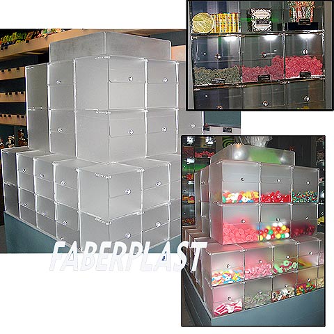 Cajas contenedores CARAMELIZATE. Conjunto modular de cajas de metacrilato (Plexiglas-PMMA) mate para todo tipo de productos de alimentacion ( caramelos, golosinas y otros ). Composición de modulos a medida para punto de venta.