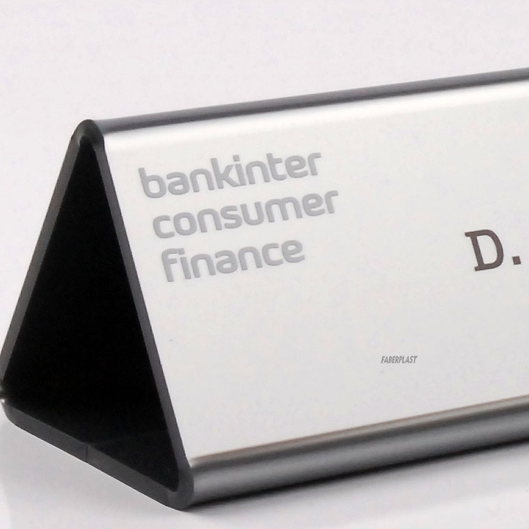 Display metacrilato realizado a medida para la entidad Bankinter Consumer Finance con motivo de la señalización en mesa de personal de la compañia.