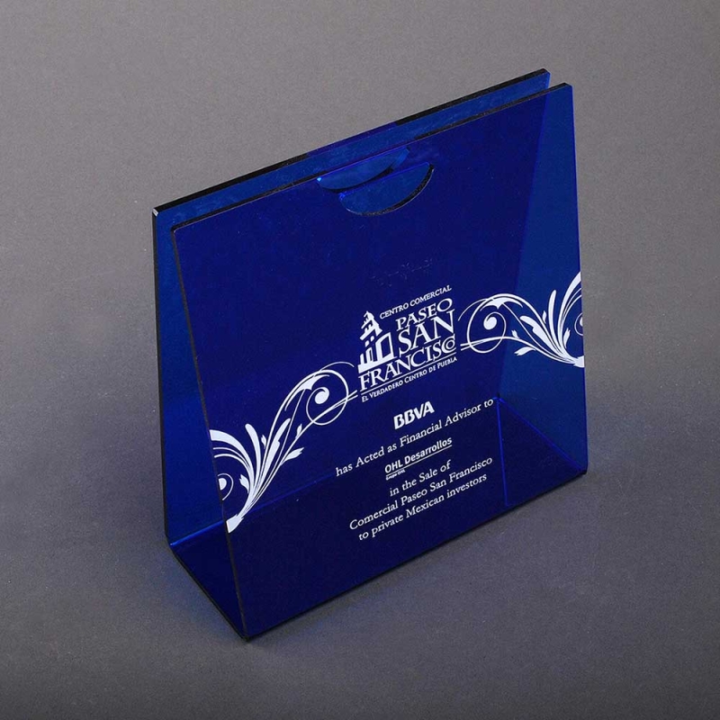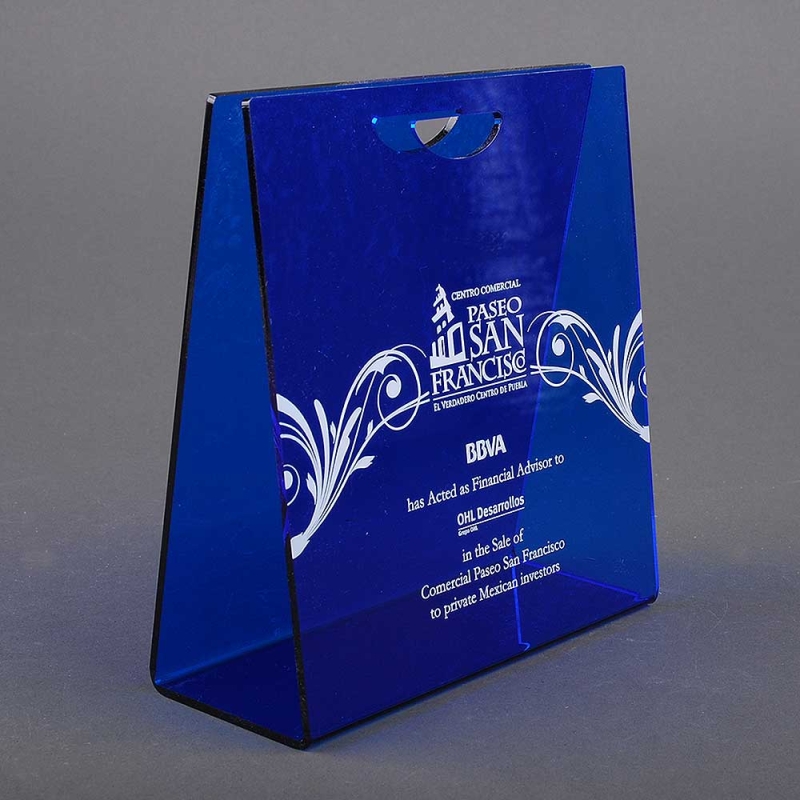 Elegante display fabricado en metacrilato (Plexiglas®-PMMA) azul traslúcido con acabado brillante. Su diseño en forma de bolsa triangular cuenta con un asa troquelada en la parte superior para facilitar su manejo y transporte.