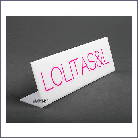 Display indicador de marca comercial en formato sobremesa. Realizado en metacrilato (plexiglas-pmma) blanco brillo y decorado con rotulación en serigrafía a una tinta.