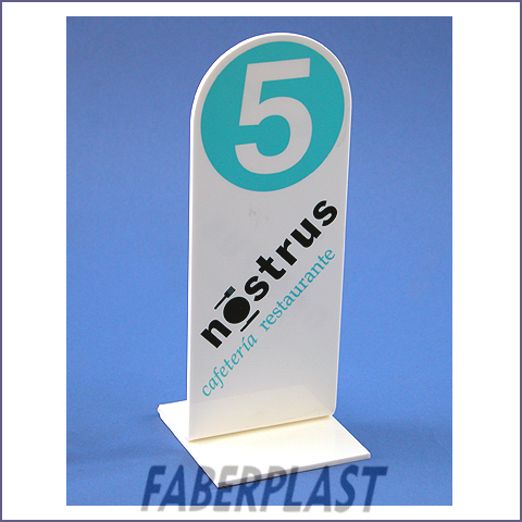 Display para Mesas de Restaurantes "NOSTRUS", realizados en Metacrilato Blanco y decorado con Logotipo Corporativo y numeración de Mesa.