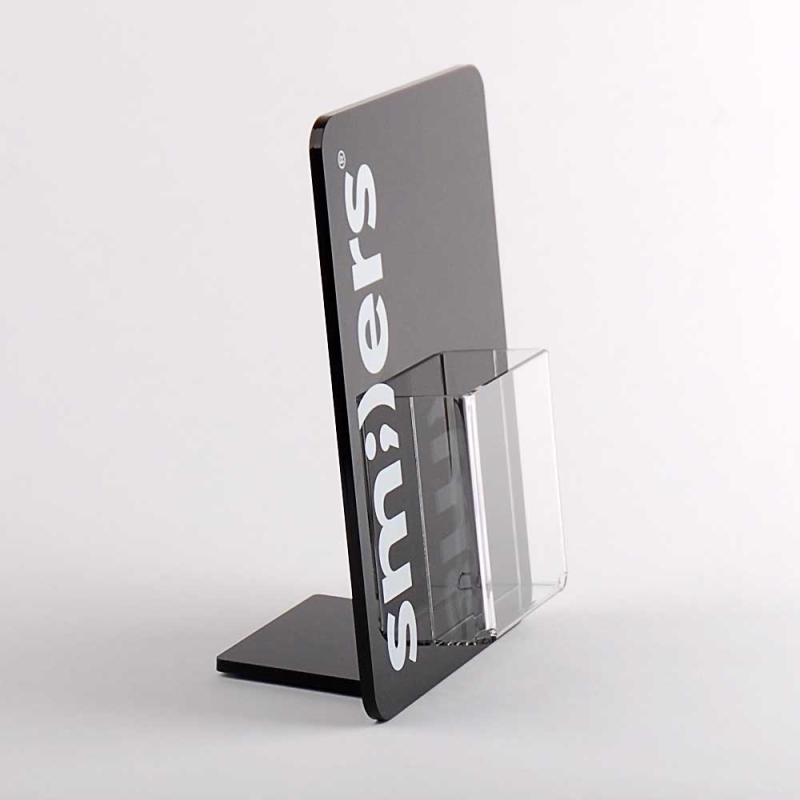 Moderno display y soporte portafolletos de metacrilato para colocación en mesa o mostrador, con soporte vertical frontal transparente, diseñado para la exposición ordenada y elegante de folletos, catálogos, tarjetas o información comercial de la marca SMILERS. Su estructura combina una base estable de metacrilato negro opaco alto brillo personalizado con un compartimento frontal transparente que permite visualizar perfectamente el material informativo. Incluye impresión digital mediante tinta blanca ECO-UV de alta calidad y resistencia con gran nitidez de colores de amplia profundidad.