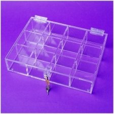 Caja metacrilato para exposición, venta y presentacion de muestras en puntos de venta, modelo: TESTER-MUESTRAS. Fabricadas con placas de metacrilato transparente (Plexiglas-pmma) con 16 HUECOS y candado seguridad.