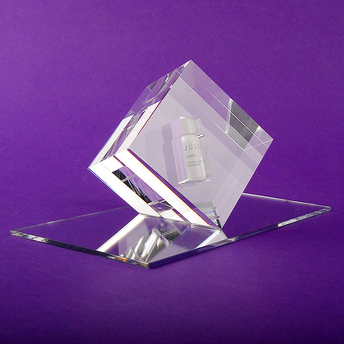 Exclusivo y original expositor de metacrilato en formato pequeño para mesa o mostrador realizado a medida para la marca de perfumerías JÚLIA.
