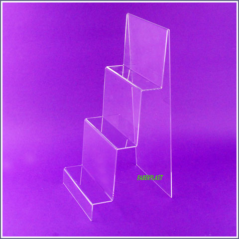 Expositor metacrilato realizado a medida en formato para mesa, mostrador, escaparte y también para superficies. Modelo para exposición de productos en el punto de venta, comercios, ferias y otros. Fabricados con placas de metacrilato transparente (Plexiglas-pmma) con 3 escalones para producto diferente.