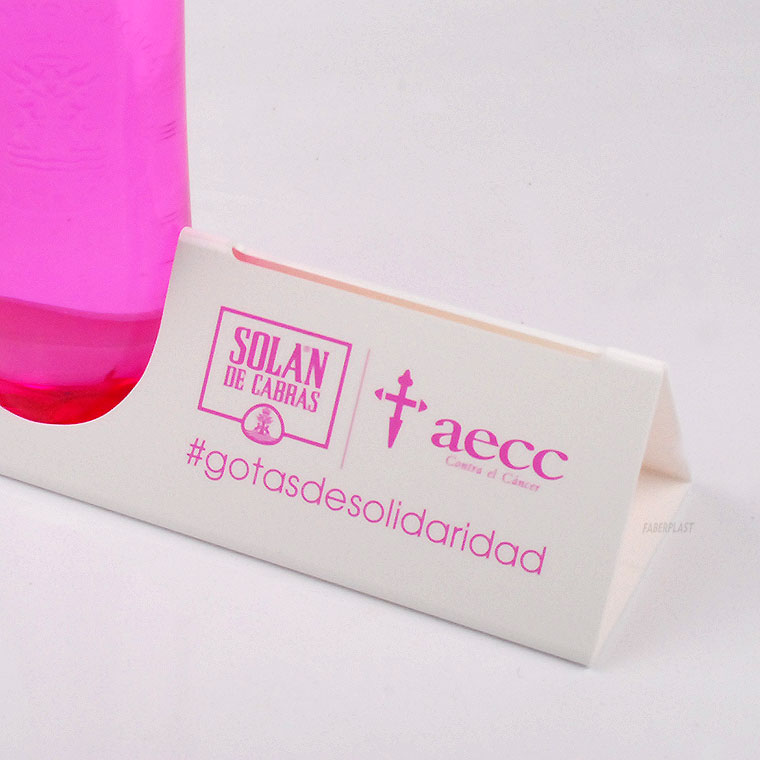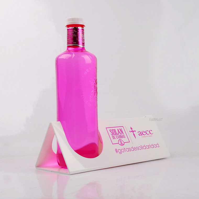 Expositor metacrilato elaborado a medida para colocación de botella de agua mineral de la marca SOLAN DE CABRAS en colaboración con la Asociación Española contra el cancer AECC.