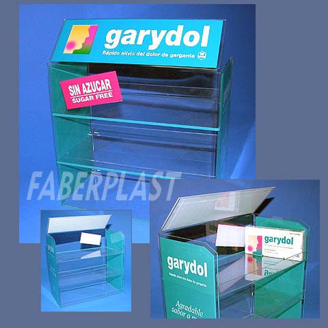 Expositor GARIDOL realizado en Metacrilato transparente y decorado con imagen corporativa de marca en serigrafía a varios colores.