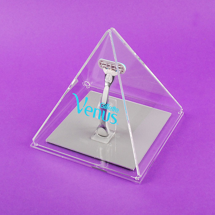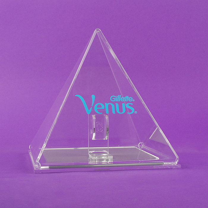 Original expositor de producto en metacrilato con formato para mesa, mostrador o lineal, realizado de forma personalizada para la prestigiosa marca GILLETTE VENUS.