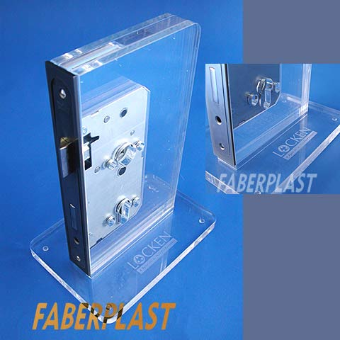 Expositor-Soporte PLV de sobremesa "LOCKEN" para exposición en puntos de venta, realizados en Metacrilato transparente.