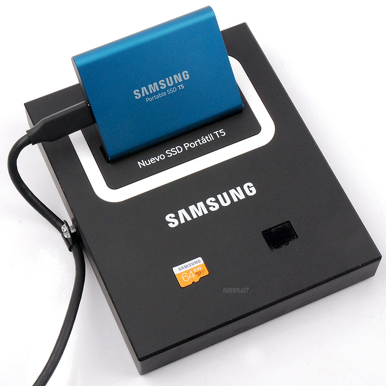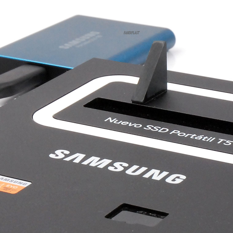 Precioso expositor plano de metacrilato realizado a medida de la compañía SAMSUNG creado para su modelo SSD portátil T5.