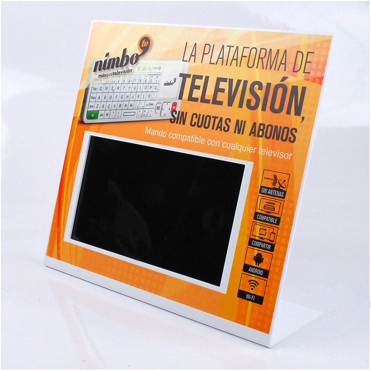 Expositor metacrilato para Tablet realizado a medida para exposición, colocación y publicidad del canal de televisión NIMBO TV.
