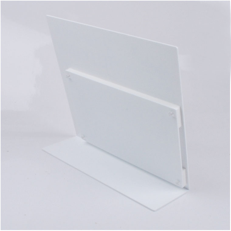 Soporte de sobremesa fabricados de forma personalizada, made in spain y con placas de metacrilato blanco brillo (Plexiglas-pmma). Incluye hueco especial para incorporar una tablet y rotulación en impresión digital.