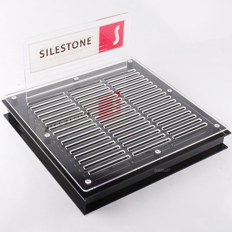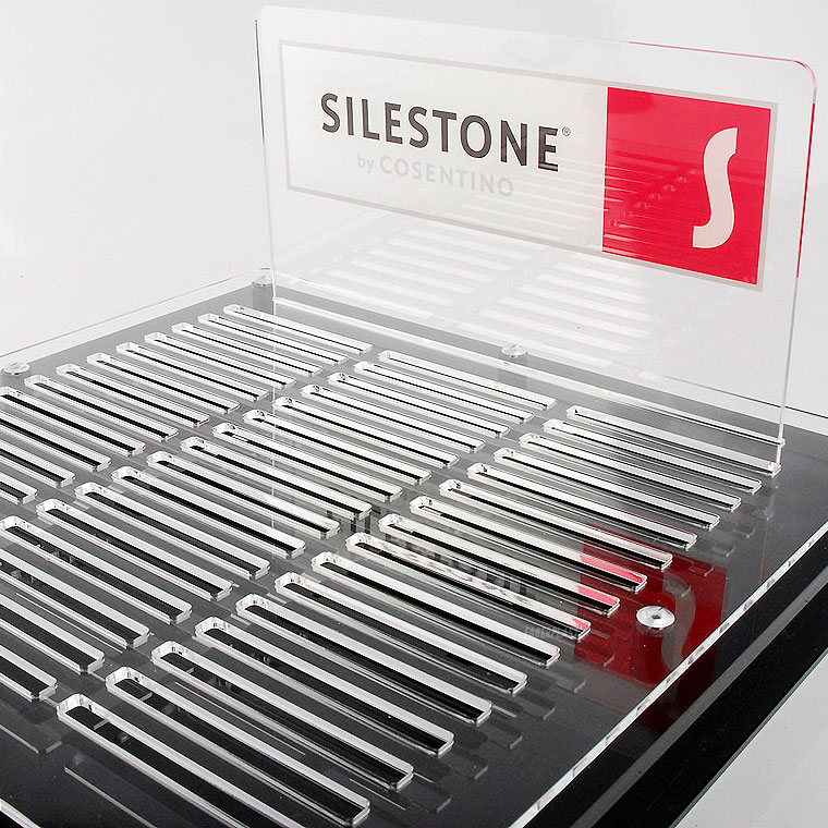 Expositor muestrario de metacrilato realizado de forma personalizada para la marca SILESTONE. Fabricados con placas de metacrilato transparente-negro (Plexiglas-pmma) y decorado mediante impresión digital directa con logotipo corporativo.