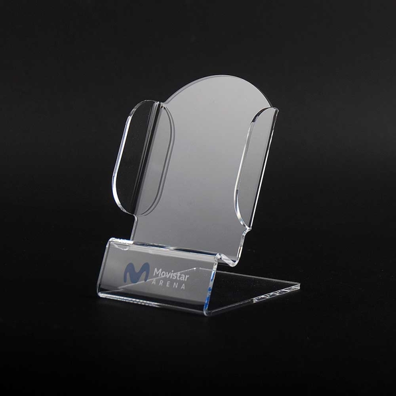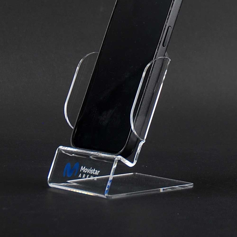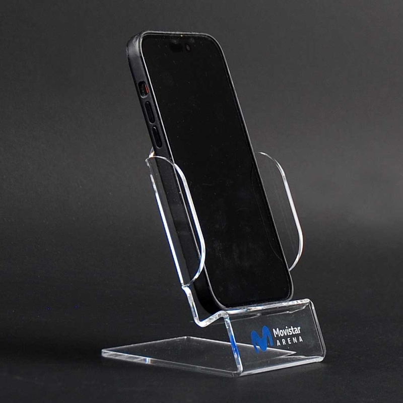 Elegante expositor y soporte de metacrilato para colocación en mesa o mostrador de todo tipo de teléfonos móviles, diseñado para publicidad de marca MOVISTAR ARENA. Su estructura combina una base estable de metacrilato transparente personalizado con un compartimento frontal transparente que permite visualizar perfectamente el smartphone. Incluye impresión digital mediante tinta blanca ECO-UV de alta calidad y resistencia con gran nitidez de colores de amplia profundidad.
