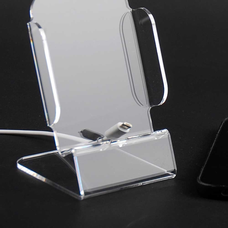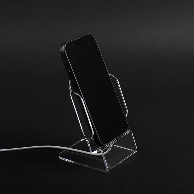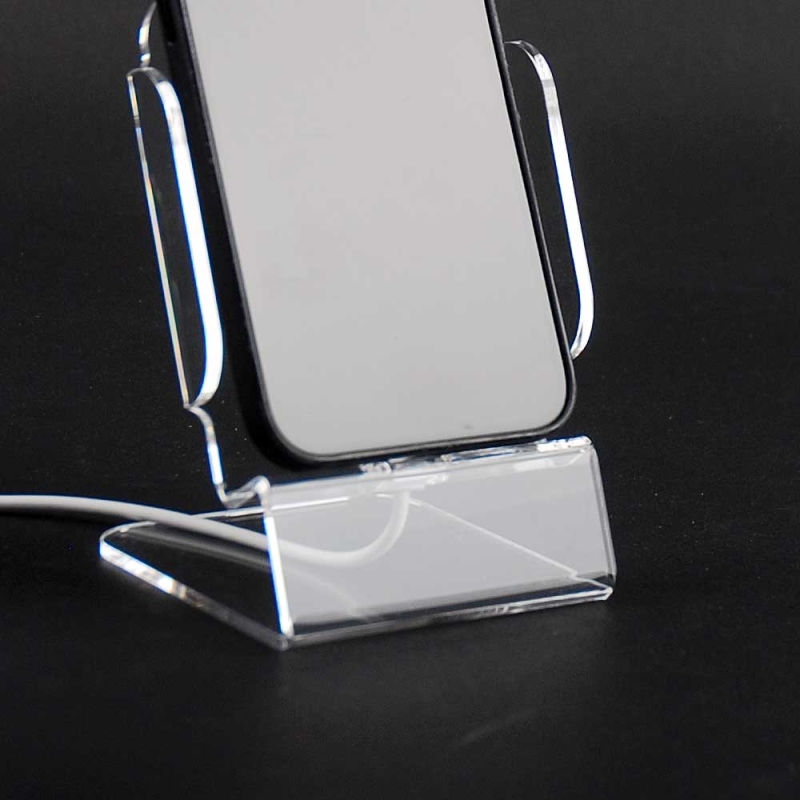 Soporte expositor JERRY de teléfonos móviles y smartphones de última generación. Para exposición, presentación y venta al público en todo tipo de puntos de venta, complemento para PLV y colocación en vitrinas de metacrilato o expositores de metacrilato. Ideal también para uso particular en tu casa, para teletrabajo y en oficinas, con este soporte tendrás tu móvil siempre a mano y en posición para usarlo. Válido para cualquier medida de smartphone o teléfono móvil del mercado. Incluye hueco para carga de cable de bateria.