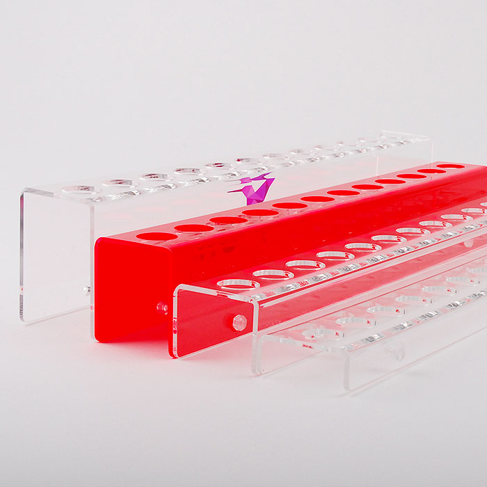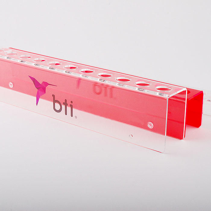 Fabricación artesana ad-hoc para colocación de productos de biomedicina y otros propios de la marca. Realizado con un formato escalonado con placas de metacrilato transparente y fucsia translúcido (Plexiglas-pmma) que incluye una impresión digital directa del logotipo del cliente.
