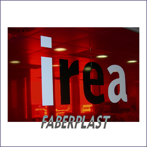Elaboración y aplicación de rotulacion de interior en IREA realizado en vinilo adhesivado rojo translucido y opaco especial cristaleras.