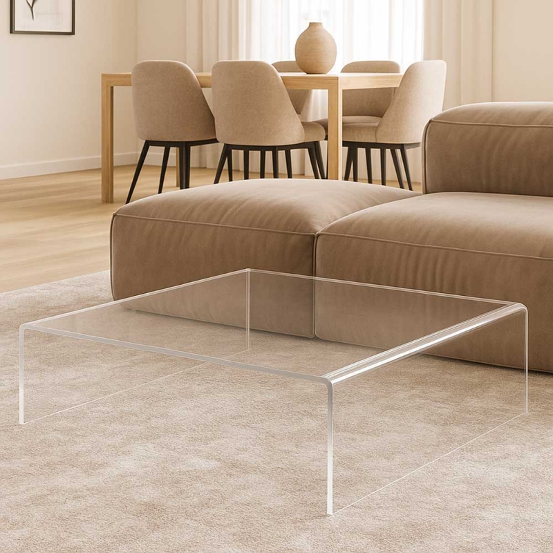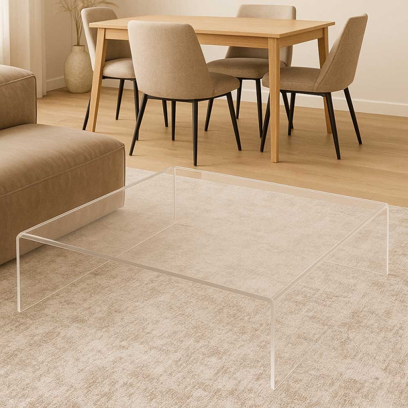 Su acabado completamente transparente crea un efecto visual ligero que amplía el espacio y permite lucir alfombras, suelos o elementos decorativos sin interrupciones. Además, el metacrilato de alta calidad aporta dureza, estabilidad y una claridad similar al cristal, pero con una resistencia superior.