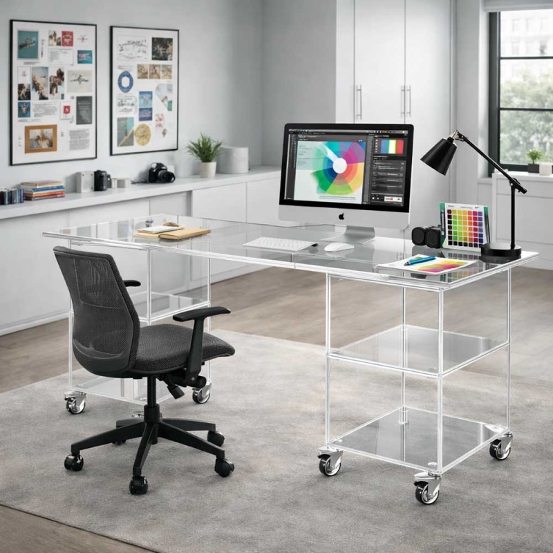 Gracias a su transparencia, la mesa se integra visualmente en el entorno sin recargar el espacio, aportando sensación de amplitud y luminosidad, lo que la hace especialmente adecuada para estudios creativos, oficinas, despachos o espacios de trabajo en el hogar.