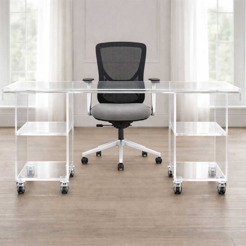 Exclusiva mesa escritorio fabricada íntegramente en metacrilato transparente de alta calidad, un material que destaca por su excelente claridad óptica, resistencia y durabilidad. Su diseño limpio y contemporáneo aporta una estética ligera y elegante, ideal para espacios de trabajo modernos donde se busca funcionalidad sin renunciar a la estética.