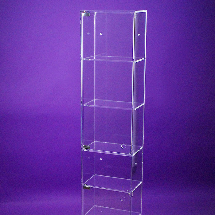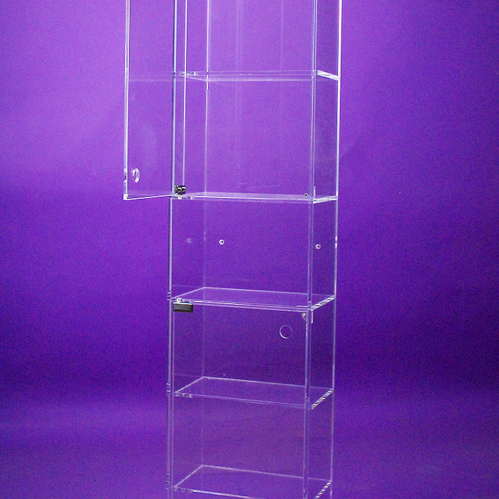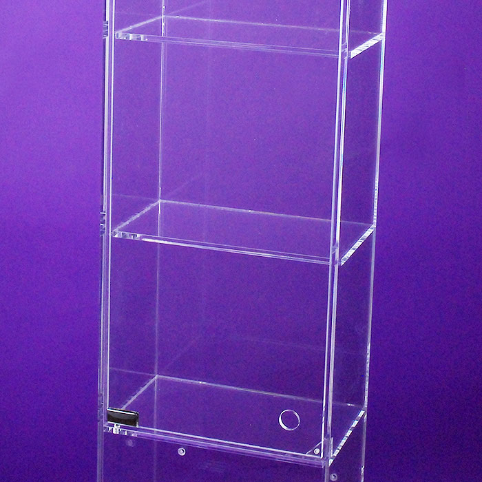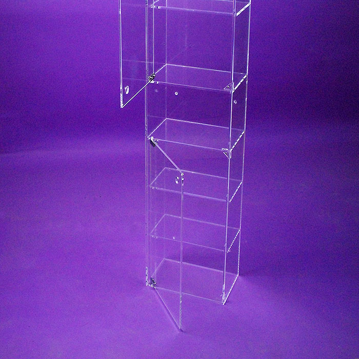 Fabricado con placas de metacrilato transparente alto espesor (Plexiglas-pmma), refuerzo metálico esquineros. Elegante diseño minimalista, sin pomos ni asas. Realizado en un único módulo con 8 huecos.