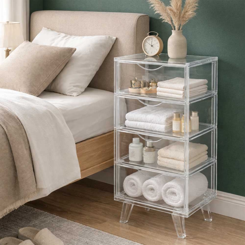 Muebles personalizados con 4 y 5 cajones respectivamente fabricados de forma artesana con placas de metacrilato transparente (Plexiglas®-PMMA). Un diseño limpio y neutro que facilita una estética ligera y elegante, ideal para espacios modernos donde se busca funcionalidad sin renunciar a la estética y también buen compañero de ambientes clásicos. Cantos suaves y pulidos incoloros extra brillantes. Made in Spain.