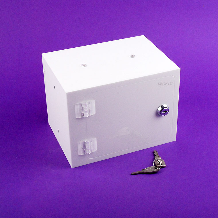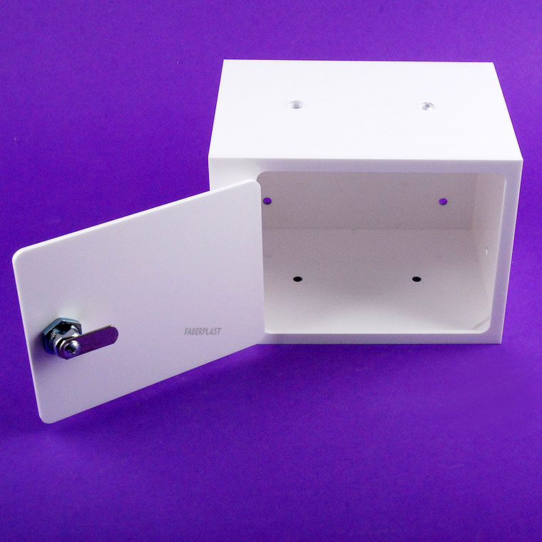 Fabricación con placas de metacrilato blanco opaco alto brillo (Plexiglas-pmma) y cerradura lengüeta tipo buzon de alta calidad (material: zamak) en acabado cromado con doble llave. Con la posibilidad de usar en formato mesa o mostrador, acoplamiento en módulos o muebles y para formato colgar/mural.
