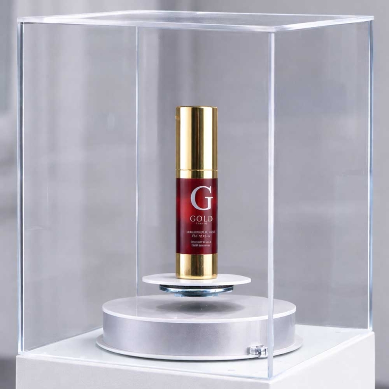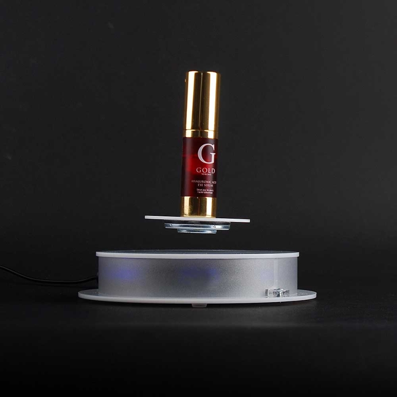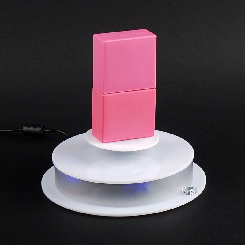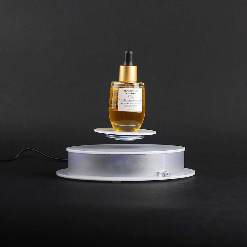 Base circular de metacrilato para levitación magnética de objetos, diseñada para la exposición de productos de forma impactante y totalmente innovadora. Gracias a su sistema electromagnético, el objeto queda suspendido en el aire, girando suavemente y captando de inmediato la atención del público.