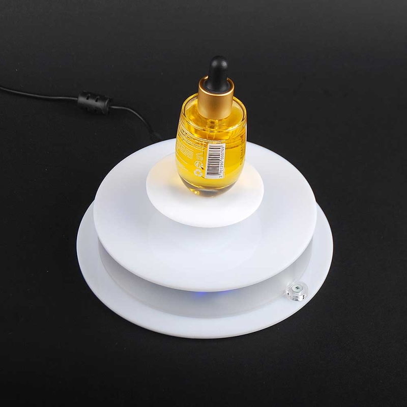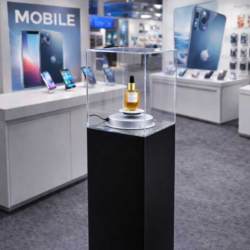 Fabricada con una estructura discreta y elegante, esta base convierte cualquier producto en un elemento protagonista, aportando un alto valor visual y tecnológico al punto de venta. Rotación suave del objeto sin contacto físico para todo tipo de objetos de exposición de hasta 500 grs.