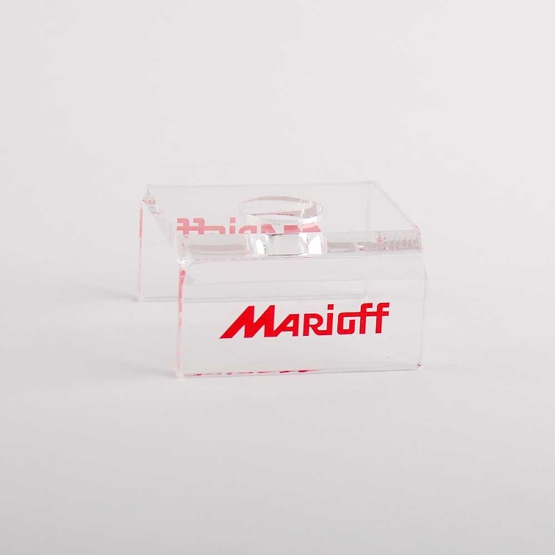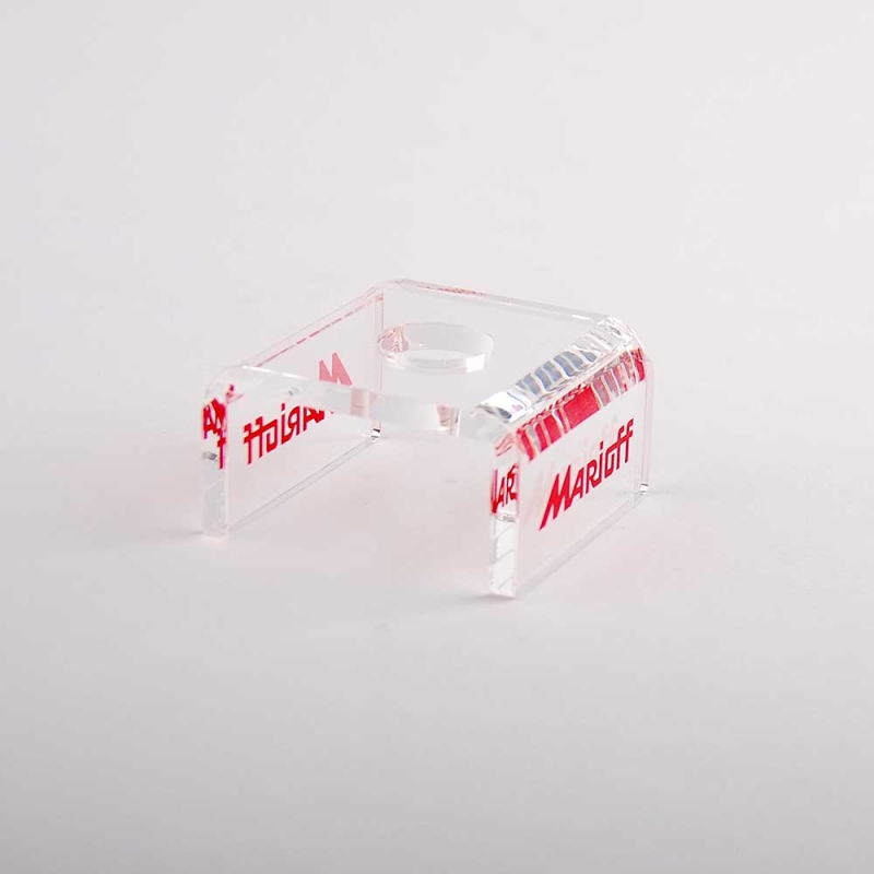 Soporte de metacrilato transparente (Plexiglas®-PMMA) de pequeño tamaño para colocación en sistemas industriales MARIOFF. Pieza procesada con láser de última generación y gran precisión. Incluyen impresión digital de logotipo mediante tintas ECO-UV de alta calidad y resistencia con gran nitidez de color de amplia profundidad. Cantos suaves y pulidos incoloros extra brillantes.