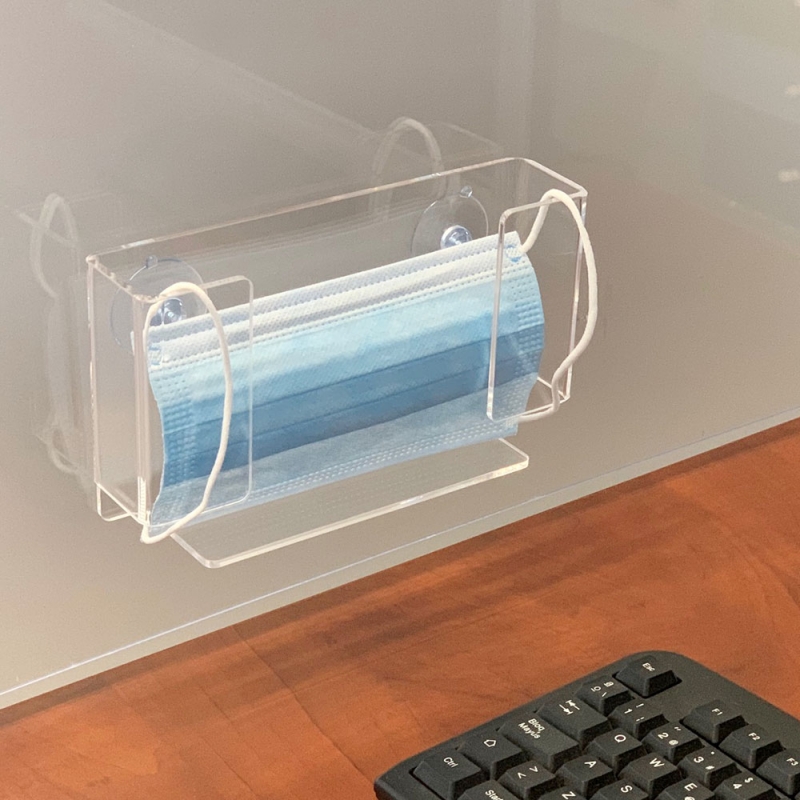 Soporte de metacrilato para MASCARILLAS quirúrgicas y otros tipos de mascarillas, con doble ventosa de alto agarre para fácil colocación en tu mampara de metacrilato o en cualquier superficie. Tu mascarilla siempre limpia y a mano, a salvo de contacto con otras superficies, conservándola higiénica cuando no la usas.