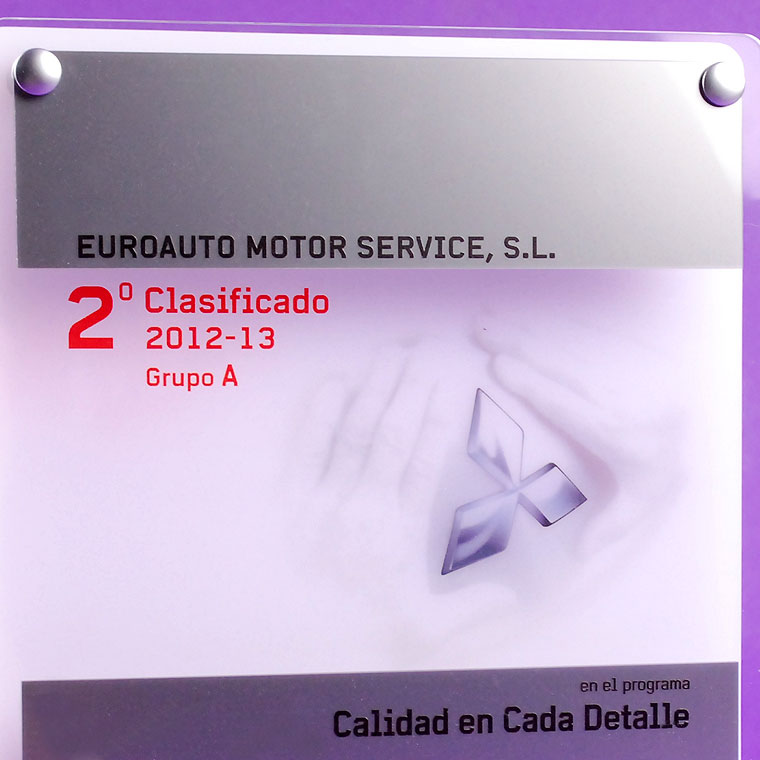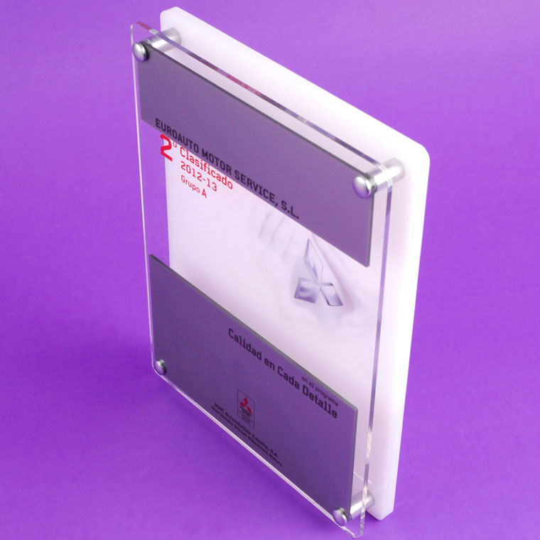 Doble placa metacrilato para la compañia Mitsubishi Motors. Realizadas en metacrilato transparente, gris plata y blanco (Plexiglas-PMMA). Incluyen decoración en impresión digital directa y separadores de acero matizados. Modelo valido para sobremesa o pared.