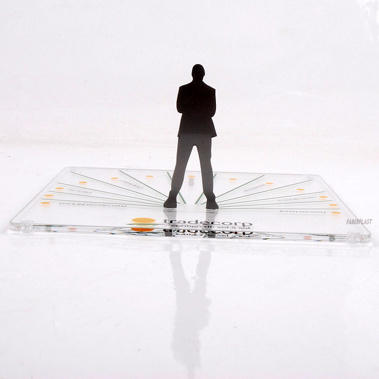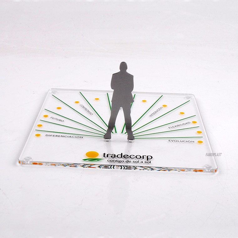 Fabricados con placas de metacrilato transparente (Plexiglas-pmma) impresas en digital y con silueta en metacrilato gris plata. Incluye logotipo cliente con colores corporativos de la marca.