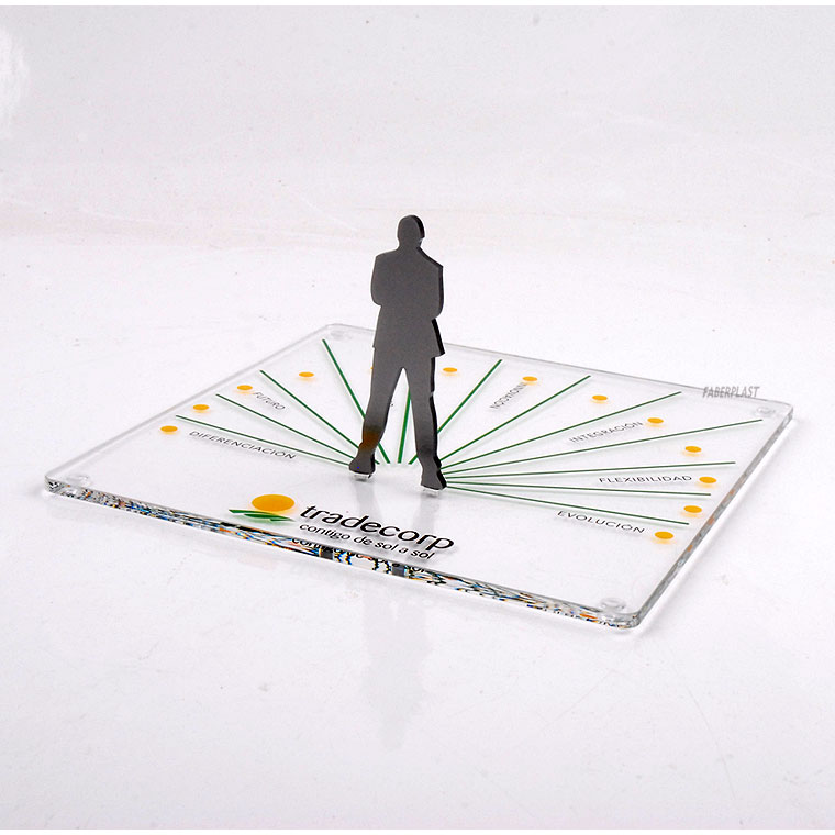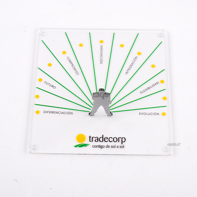 Regalo de metacrilato realizado ad-hoc para la compañia Tradecorp. Objeto creativo que simula un reloj solar con diseño facilitado por el cliente según su creatividad propia.