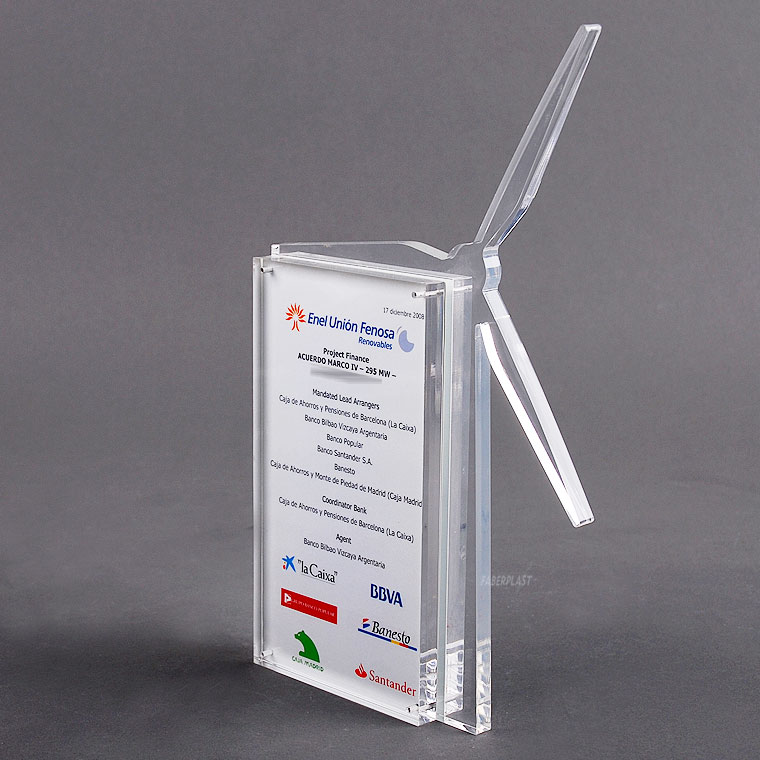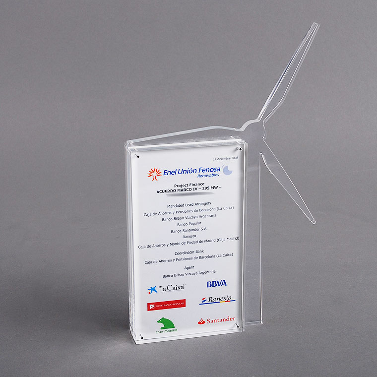 Triple pieza metacrilato (Tombstone) realizado a medida para la unión de compañías ENEL UNION FENOSA.