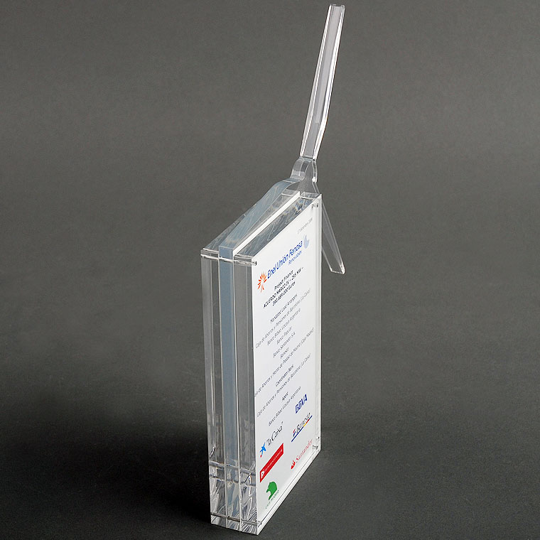 Fabricados con placas de metacrilato transparente (Plexiglas-pmma) para inclusión interna de documento. Incluye pieza silueteada mediante corte de láser de alta precisión, unido todo el conjunto con pasadores de acero.